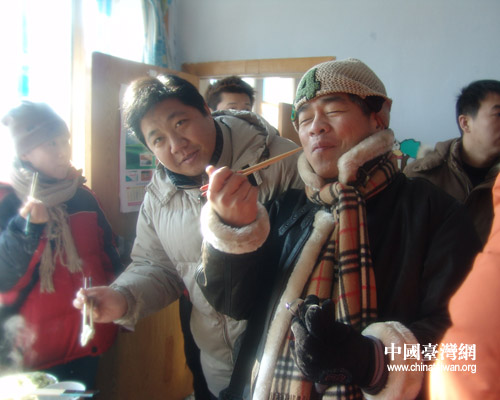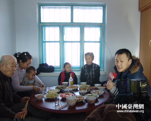 記者們到達時,王慶榮一家人正在吃午飯。臺灣年代電視臺的記者陳立國經不住火炕的溫暖,地道的東北農家菜的吸引,爬上火炕與大家坐到一起。