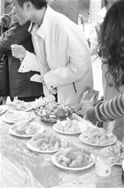 “棺材板,是什么東東,也能吃啊?”“啊,還有傳說中的臺灣水果啊。”臺灣美食的魅力果然不小,盡管下著小雨,不過話音才落,過往的廈大學子紛紛駐足,嘗嘗這餅,品品那糖,“味道還真不錯耶”。
