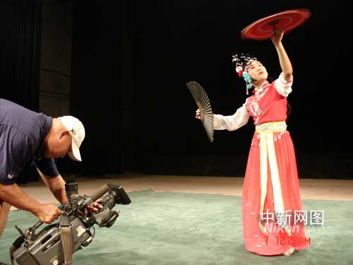 攝制組人員拍攝山西運城市藝術(shù)學校小梅花演員的演出。