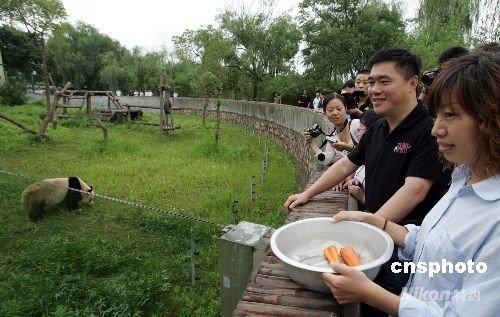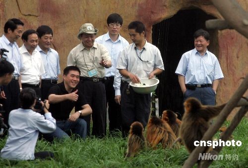 6月25日上午,臺北市長郝龍斌一行到上海野生動物園,看望大熊貓和金絲猴。郝龍斌希望上海的大熊貓和金絲猴能落戶臺北,此外臺北的紅毛猩猩、白毛長臂猿能到上海。他認為,珍惜的野生動物能在異地落戶生存,有利于生態。 中新社發 潘索菲 攝