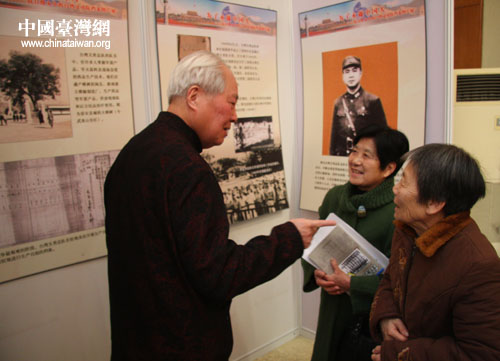 臺灣義勇隊老隊員鄭堅(左)與曾加入臺灣少年團的張秀卿(右)、劉惠敏參觀《臺灣義勇隊檔案圖片展》。(攝/張弛)
