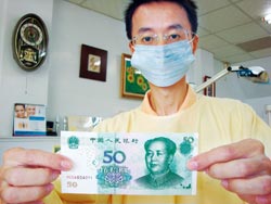 牙醫師何正忠手上拿的50元人民幣,是大陸遲緩兒唐正跳繩獲得的獎勵金,他要捐給臺灣災民。圖片來源:臺灣《中國時報》