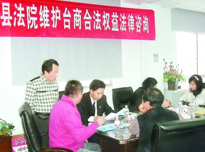 8月5日,該縣又成立福建省首個涉臺法律服務中心,建立“涉臺法律服務中心律師團”,12位律師將定期值班,為臺商、臺企、臺胞、臺屬提供免費的法律咨詢。8月18日,長期在漳浦投資興業且在當地臺商中威望較高的陳隆峰、蔡永合被聘為漳浦縣人民法院涉臺案件人民陪審員。