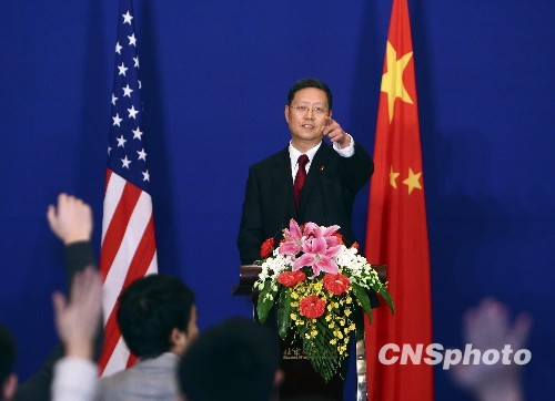 11月17日,中國外交部副部長何亞非在北京國際飯店就中國領導人與美國總統奧巴馬會談會見情況和中美關系等問題答記者問。 中新社發 杜洋 攝