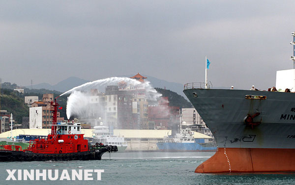 資料圖片:2008年12月15日,即將遠(yuǎn)航的船舶接受?chē)娝8!.?dāng)日,臺(tái)灣萬(wàn)海航運(yùn)、陽(yáng)明海運(yùn)、臺(tái)灣航業(yè)、福建華榮等4家航運(yùn)公司聯(lián)合舉辦的兩岸海運(yùn)直航基隆首航儀式在臺(tái)灣基隆港舉行。新華社記者 陳斌華攝
