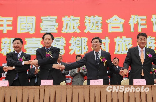 5月6日,福建省旅游協會、福建10家赴臺游組團社,臺灣觀光公(協)會、旅行社以及閩臺航空業界代表在臺灣苗栗縣共同簽訂了“2010年閩臺旅游合作協議”。根據協議,2010年福建將積極組織經福建口岸赴臺游超過12萬人次。 中新社發 羅欽文 攝