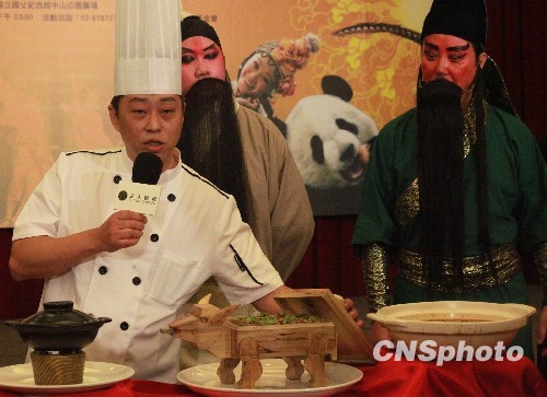 5月20日,成功研發“三國宴”的四川成都武侯祠錦里三顧園行政主廚沈明杰,在臺北的“三國宴”記者會上向媒體介紹“木牛流馬”菜色典故。經典“三國宴”首度入臺展廚藝,為臺灣食客演繹三國掌故與道地川味的創意結合。 中新社發 羅欽文 攝