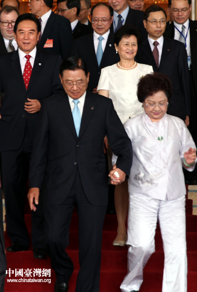 6月30日,兩岸兩會第五次領導人會談圓滿落幕, 在海協會會長陳云林等人的陪同下,臺灣海基會董事長江丙坤攜夫人走出下榻酒店,前往機場。(中國臺灣網 鐘寶華 攝)