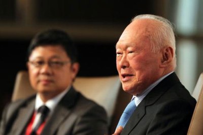 李光耀(前右)12日出席在新加坡舉行的首屆慧眼中國環球論壇,針對中美關系、中國政治經濟發展發表看法。(來源:聯合早報)