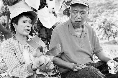 圖為何文淵夫婦倆席地而坐,探討蓮霧的色澤和質量。圖片來源:福建日報