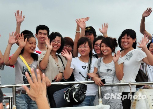 資料圖片:2009年9月16日,起程赴臺就讀一年的福建23名在校大學生在福州馬尾登船后,向前來送行的家人和師生揮手告別。這是福州大學、福建師范大學等福建高校近200名赴臺學生中首批前往臺灣的學生,也是大陸率先成批次選派學生赴臺灣高校學習。中新社發 張麗君 攝