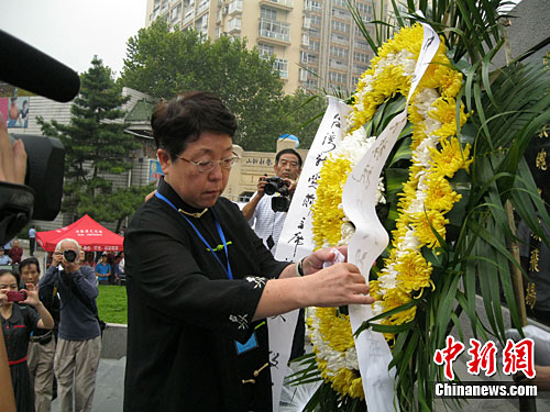 圖為臺灣新黨原主席謝啟大女士為抗日烈士敬獻花圈。中新社發 劉柱 攝