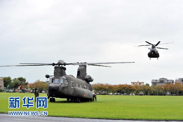 10月28日,救援運輸機在進行起飛前準備。當日,臺灣宜蘭蘇花公路塌方救援行動在陣雨中繼續進行,臺方出動200多人進行搜救,并動用運輸直升機運送一輛小型挖土機至114.5公里路段進行救援。救援人員還將視天氣情況增運5輛小型挖土機前往搜救點。新華社記者何俊昌 攝