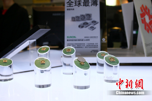 在“臺灣精品館”的精品中,一枚比一角硬幣還小的風扇引來眾多參觀者駐足。“臺灣精品館”相關負責人告訴記者,這枚全球最薄的微型風扇是臺灣建準科技研發制造,其厚度僅0.3公分,是全球已量產風扇中最薄的微型風扇,被廣泛應用在新一代平板計算機和手機內,其使用極微的電力,即可產生良好的散熱效果。