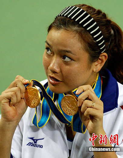 第十六屆廣州亞運會網球雙打決賽11月22日結束,中華臺北選手詹詠然獨得女雙與混雙兩枚金牌。中新社記者 趙振清 攝