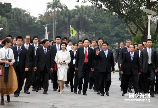 陳云林及夫人一行不到8點就來到花博會,趕在對外開放前進入園區(qū),以盡可能減少對市民正常參觀的影響。在海基會董事長江丙坤及臺北市市長郝龍斌陪同下,陳云林伉儷參觀了爭艷館、西安園等景點。