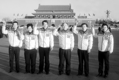 喬繼鋒(左四)等6位農(nóng)民兄弟在北京天安門前合影。吳明 攝