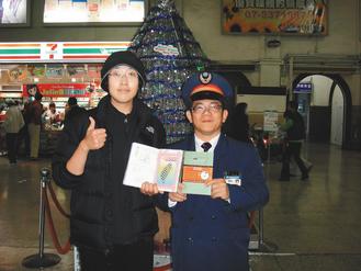 來自北京的交換學生傅超(左)臺南站集滿百戳,與臺南站長陳榮彬合影。圖片來源:臺灣《聯合報》