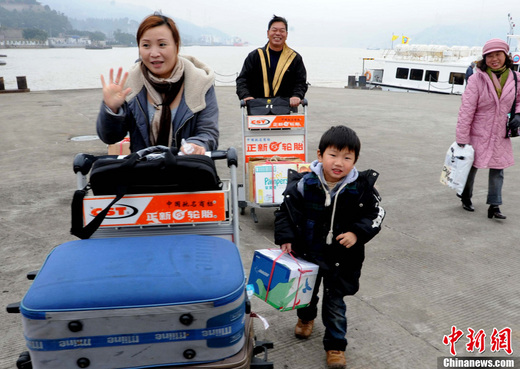 1月19日春運首日,乘坐“兩馬” ( 馬尾——馬祖)航線“閩珠一號”客輪返鄉(xiāng)過年的臺胞抵達福州港馬尾客運碼頭。預(yù)計春運期間“兩馬”航線運送旅客人數(shù)約5000人次。2011年是“兩馬”航線運行的第十一個年頭,十年間,福州邊檢站共檢查兩岸直航船舶7386艘次,旅客395564人次。中新社記者 劉可耕 攝