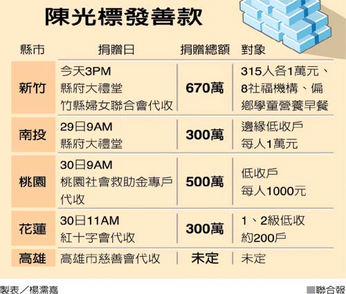陳光標接著的行程,依序到南投、桃園、花蓮、高雄發善款。陳光標29日到南投縣政府大禮堂,發給300個低收邊緣戶,每人1萬元;桃園縣行程則為30日上午,陳光標捐助500萬元,由桃園縣社會救助金專戶代收;陳光標捐給花蓮300萬元,30日由紅十字會花蓮支會代收,捐贈對象為一、二級低收入戶。紅十字會花蓮友會表示,受贈者估計約200多戶。(中國臺灣網 馮存健)