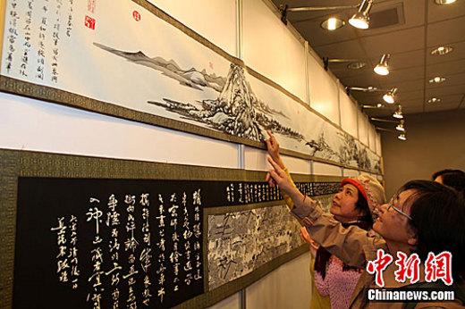 3月7日下午,出自大陸名家之手的長幅剪紙藝術作品《富春山居圖》(上)、《清明上河圖》,一同亮相張家口蔚縣民俗文化藝術展,吸引臺灣民眾駐足欣賞、評頭品足。中新社發 董會峰 攝
