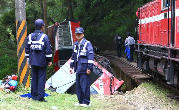 4月27日,警察在臺灣阿里山火車事故現(xiàn)場警戒。記者從臺灣觀光主管部門獲悉,截至27日15時30分,在阿里山小火車翻車事故中,共有5個大陸旅行團涉及,已確認23人受傷、5人死亡、1人失蹤,確認死亡的5人均為大陸游客。嘉義縣政府消防局表示,這起意外發(fā)生在中午12時17分左右,一列掛有8節(jié)車廂的小火車從神木站開往阿里山站,行經(jīng)70公里250米處,突然有棵大楠木枝干斷裂,剛好擊中最后一節(jié)車廂,結(jié)果造成多節(jié)車廂翻覆,釀成意外。新華社記者龔兵攝