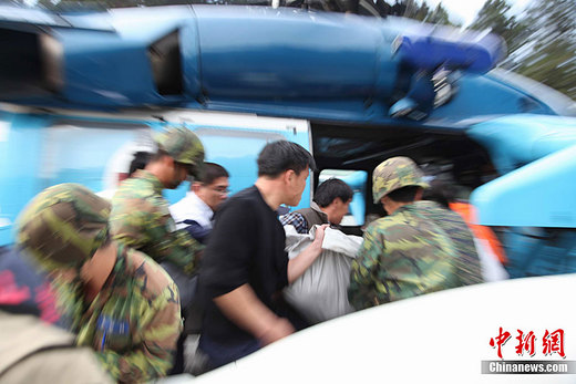 4月27日,臺灣阿里山景區(qū)發(fā)生小火車翻車事故,現(xiàn)場被當(dāng)?shù)鼐椒怄i。下午5點,最后兩個大陸游客遇難者遺體被抬上直升飛機。中新社發(fā) 沈存旭 攝