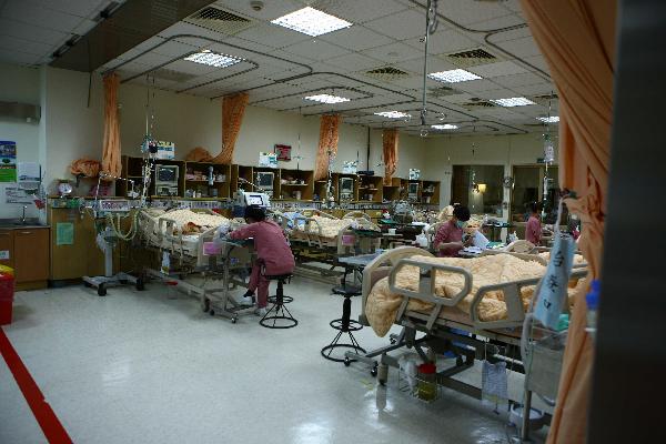 4月28日,工作人員在臺灣嘉義市圣馬爾定醫院的加護病房內忙碌。當日,在阿里山火車事故中受傷的大多數乘客已出院,目前留在圣馬爾定醫院接受治療的還有16人,其中兩名重傷員仍在加護病房中接受治療。臺灣阿里山27日中午發生小火車翻車事故,截至當天晚間11時,事故已造成5名大陸游客罹難,百余名大陸游客不同程度受傷。 新華社記者龔兵攝