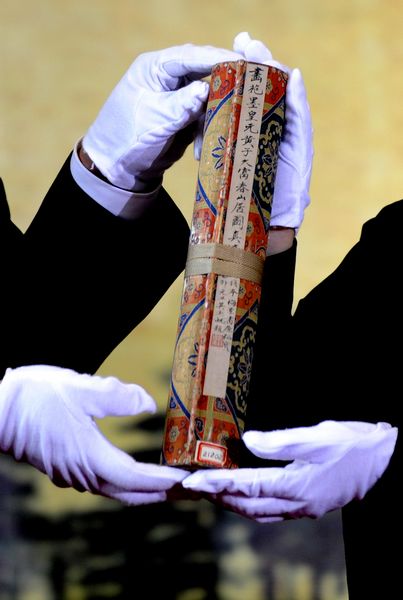 5月11日,工作人員在啟運儀式上展示《富春山居圖》(剩山圖)。 當日,浙江省博物館的“鎮館之寶”《富春山居圖》前半段(剩山圖)赴臺啟運儀式隆重舉行!陡淮荷骄訄D》(剩山圖)在浙江省博物館點交啟運,將經由北京后赴臺,于6月1日在“山水合壁——黃公望與《富春山居圖》特展”上,與臺北故宮博物院所藏《富春山居圖》(無用師卷)聯合展出。這將是該畫作兩部分在分別360年后首次實現合璧。新華社發(梁臻 攝)