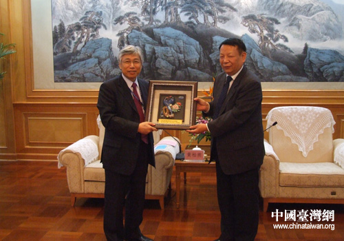 遼寧省副省長滕衛(wèi)平與來遼參訪臺灣生技醫(yī)藥界代表互贈禮物(圖片來源:本溪市臺辦)