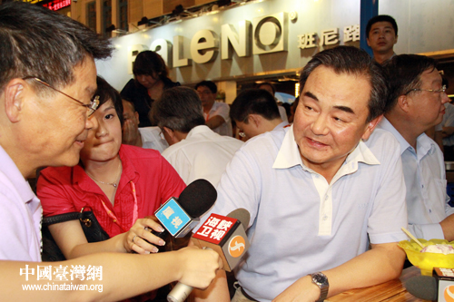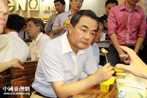 中國臺灣網6月12日廈門消息 6月12日下午,正在廈門出席第三屆海峽論壇的國務院臺辦主任王毅參觀了在廈門市中山路舉行的臺灣特色廟會,與參展的臺灣民眾親切交流,體驗富有特色的臺灣廟會,品嘗原汁原味的臺灣小吃。王毅先后來到屏東水果、阿里山茶、桃園豆干、冠軍牛肉面等攤位前,與前來參展的臺灣鄉親親切交談,并向他們詢問展品的生產種植、銷售情況等,還親自品嘗了部分特色小吃。