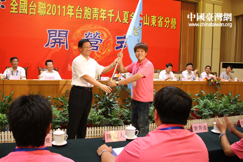 在開營式上,省委副書記、省政協主席劉偉向夏令營山東分營授了營旗。(圖片來源:山東省臺聯)