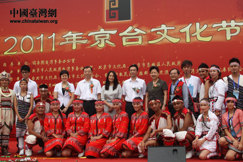 中國臺灣網9月1日北京消息 今日上午,以“交流·融合”為主題的2011年京臺文化節在北京前門臺灣文化商務區開幕。國臺辦交流局副局長嚴中洲、北京市臺辦主任馬玉萍、北京市文化局局長肖培、臺灣少數民族知名人士高金素梅等出席了開幕式。