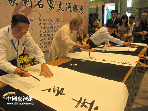 中國(guó)臺(tái)灣網(wǎng)11月3日成都消息 日前,由四川省臺(tái)灣同胞聯(lián)誼會(huì)、四川省書法家協(xié)會(huì)主辦,四川省巴蜀音像制作中心、藝術(shù)影像網(wǎng)和臺(tái)灣高雄市中華文化經(jīng)貿(mào)交流發(fā)展協(xié)會(huì)承辦的“辛亥百年——海峽兩岸書畫篆刻名家交流聯(lián)展”在臺(tái)灣臺(tái)北、高雄兩地隆重舉行。四川省臺(tái)聯(lián)會(huì)長(zhǎng)劉琪、省書協(xié)主席何應(yīng)輝率四川書法篆刻名家一行24人,攜90幅精品參加展出,并進(jìn)行文化交流。