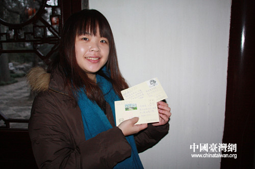 臺(tái)灣成功大學(xué)學(xué)生楊雅嵐寄給臺(tái)灣朋友的明信片。(中國臺(tái)灣網(wǎng) 栗琰 攝)