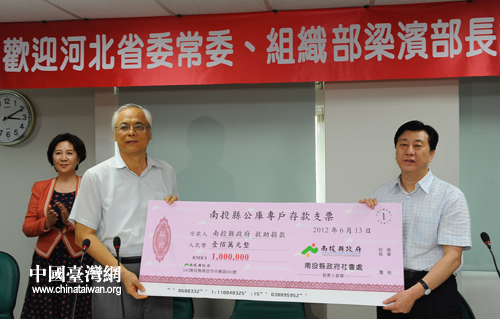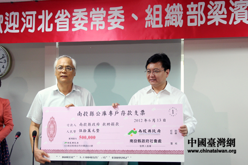 6月13日,河北省委常委、組織部部長梁濱在南投縣捐款100萬人民幣用于賑災。(中國臺灣網 馬迪 攝)