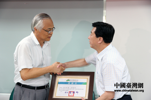 南投縣副縣長陳志清(左)代表災區民眾感謝河北省的賑災善舉。(中國臺灣網 馬迪 攝)