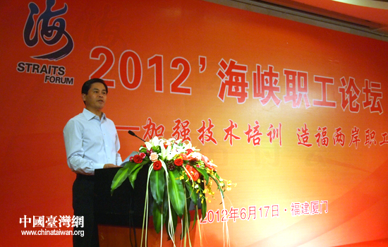17日,第四屆海峽論壇·海峽職工論壇在廈門舉行。圖為中華全國總工會副主席、中國職工交流中心會長陳豪致辭。(中國臺灣網(wǎng) 張瑞宸 攝)
