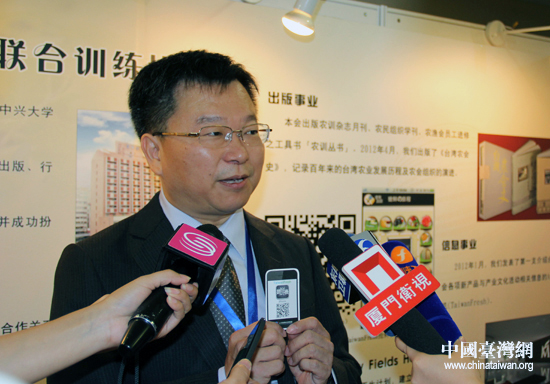 臺灣農民團體干部聯合訓練協會秘書長王志文向記者大力推介所在協會最新參與研發的智能手機軟件“搶鮮機”。(中國臺灣網 王思羽 攝)