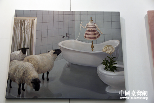 在臺灣藝術品展區,記者還看到不少表達人類日趨物質化、疏離冷漠的作品,不過也見到有描繪東北平原景象的畫作:1960年代風貌的集市中,兩名面容敦厚的姑娘坐在路邊休息,身邊是巨大的菜籃、水壺與蔬果——透露出臺灣藝術家對大陸一個遙遠年代的有趣想象。