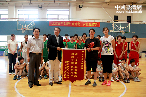 24日下午,北京青年女籃與臺灣臺北女子第一高中女子籃球隊在首鋼籃球中心展開一場跨越海峽的友誼賽。賽后,北京市臺聯、艾荷華農莊海峽體育俱樂部和灣臺北第一女子高中籃球隊聯名向北京首鋼籃球俱樂部贈送錦旗。(中國臺灣網 普燕 攝)