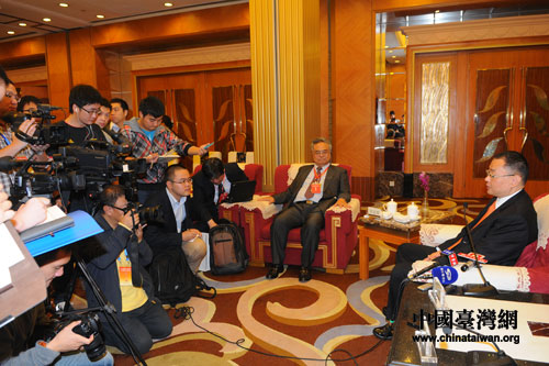 兩岸媒體聚焦第四屆西部海峽兩岸電子信息產(chǎn)業(yè)合作研討會,圖為臺灣區(qū)電機電子工業(yè)同業(yè)公會理事長焦佑鈞答記者提問。(中國臺灣網(wǎng) 王曉蕊 攝)