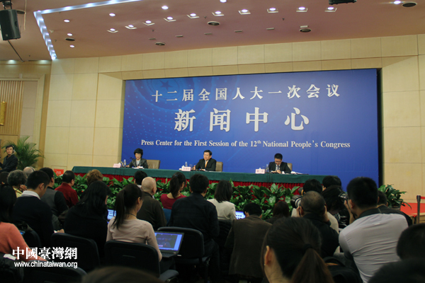 十二屆全國人大一次會議8日上午在梅地亞中心舉行記者會,商務部部長陳德銘就“發展國內外貿易和促進經濟合作”的相關問題回答了中外記者提問。( 中國臺灣網 楊麗 攝)