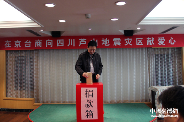 北京市臺資企業協會23日上午舉行獻愛心活動,向四川蘆山地震災區的同胞捐贈救災款項。(中國臺灣網 楊麗 攝)