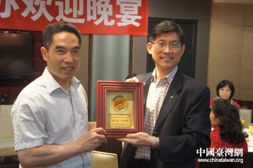 5月15日晚舉行的歡迎晚宴上,四川省臺辦副主任趙宇與臺灣參訪團團長李玉文先生互贈禮品。圖片來源:四川省臺辦