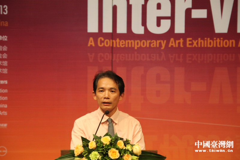 由中華文化聯(lián)誼會、臺灣美術(shù)基金會、中國美術(shù)館、臺灣美術(shù)館聯(lián)合主辦的“2013海峽兩岸當代藝術(shù)展”,8月26日在中國美術(shù)館開幕,臺灣美術(shù)館副館長張仁吉在開幕式上致辭。(中國臺灣網(wǎng) 蕪同 攝)