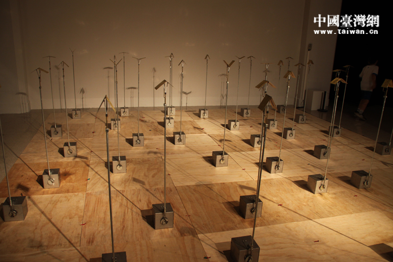 臺灣藝術(shù)家徐瑞憲的作品“旅行者之翼”用金屬、銅片、馬達、電線、變壓器、感應(yīng)器等制作,只要有人走近,金屬片就會煽動象征車票般的翅膀,從而實現(xiàn)與觀者的互動,堪稱神奇。(中國臺灣網(wǎng) 蕪同 攝)