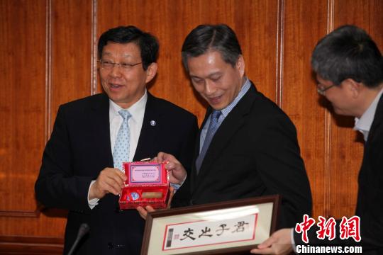 圖為陳德銘在臺中港務分公司獲贈印章。 董會峰 攝