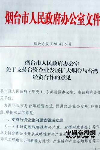 為進一步貫徹省政府工作部署,經煙臺市政府批準,在征詢市財政、教育、科技等25個主管部門意見的基礎上,煙臺市臺辦代市政府辦公室起草了《煙臺市人民政府辦公室關于支持臺資企業發展擴大煙臺與臺灣經貿合作的意見》,提出25條具體意見,鼓勵臺資企業向更寬的領域發展,加大對臺資企業企業的金融、財稅和用工支持,強化各項涉臺服務措施。該文件已于2014年1月發布實施。