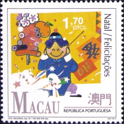 澳門1991年11月29日發行一套4枚《祝賀》郵票,其中一枚中式打扮的男童燃放鞭炮(圖②),背景可見桃花、年橘、倒貼的“!弊趾陀∮小凹弊值睦欠猓笠缰鴿庥舻倪^年氣氛。